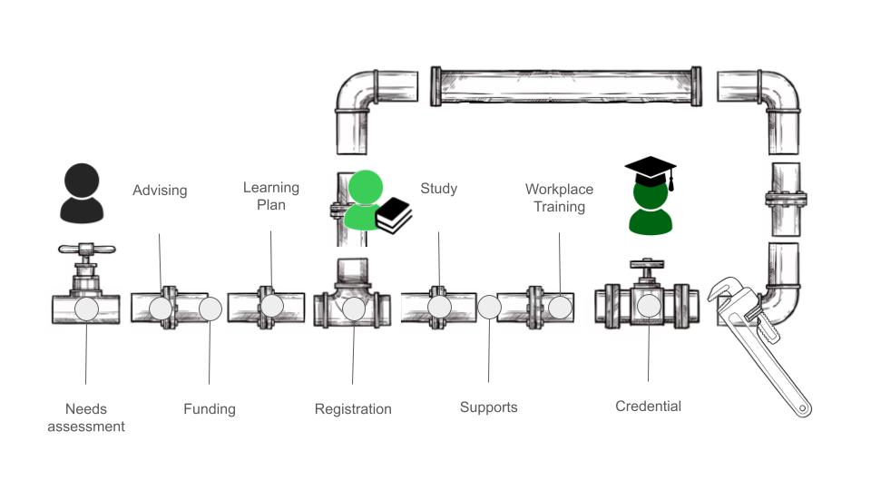 A learning plan is an outline used by a learner to achieve a specific learning goal. A learning plan is the move from informal to formal education as the learner moves into the spaces of industry and community. It is both a negotiation and an agreement to work with stakeholders and support agencies to make their individual goals align with industry and community goals and to make these goals achievable. A learning plan is a commitment. In short, a learner chooses a learning pathway, a field of study or potential career. This choice is based on personal goals and industry or community opportunities. This learner then meets with a learning pathway advisor to turn this learning pathway into a learning plan. This plan will articulate funding needs and sources, essential competencies, relevant programs of study, registration with learning organizations, access to supports, workplace training opportunities, and credentials. See Figure 1: Learning Plan Pipeline to follow this learning plan process.